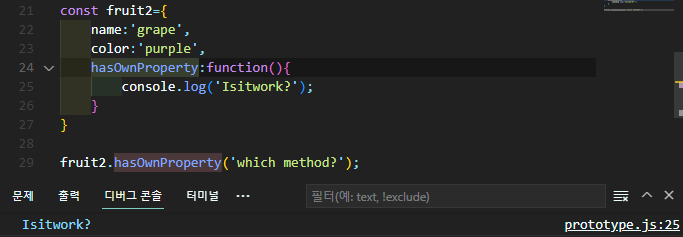이쯤에서 fruit의 속성은 무엇이 있는지 궁금해서 hasOwnProperty메서드를 사용해 알아보았다.