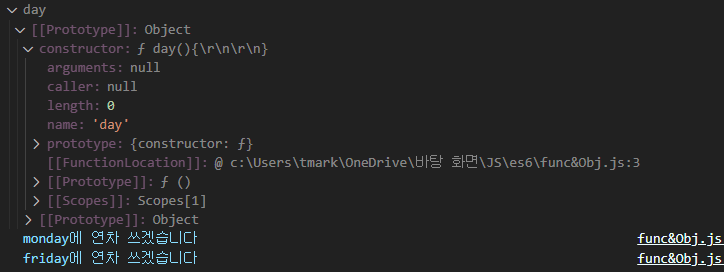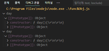 두 객체의 proto속성은 모두 day 함수의 prototype객체를 가르키는 것을 알 수 있다.
