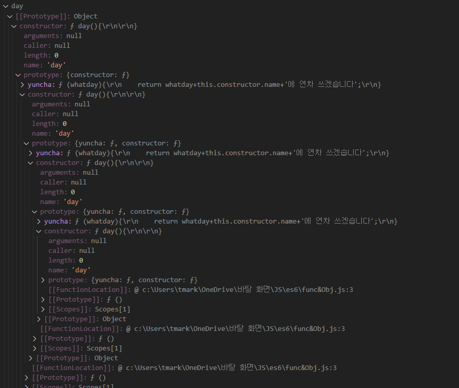 두 객체의 proto속성은 모두 day 함수의 prototype객체를 가르키는 것을 알 수 있다.