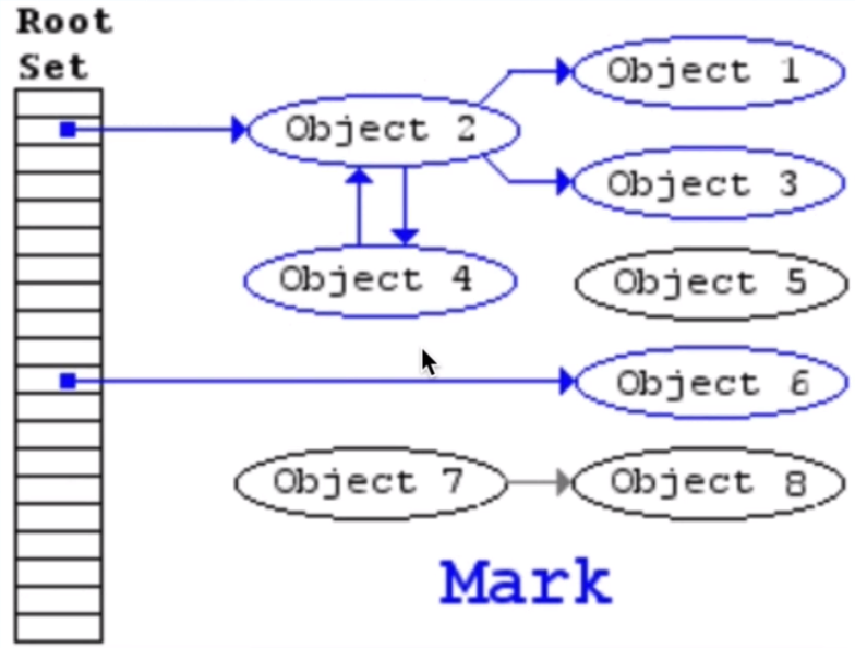 가비지 컬렉션을 사용하는 데에 Mark and Sweep이라는 알고리즘을 사용한다.
