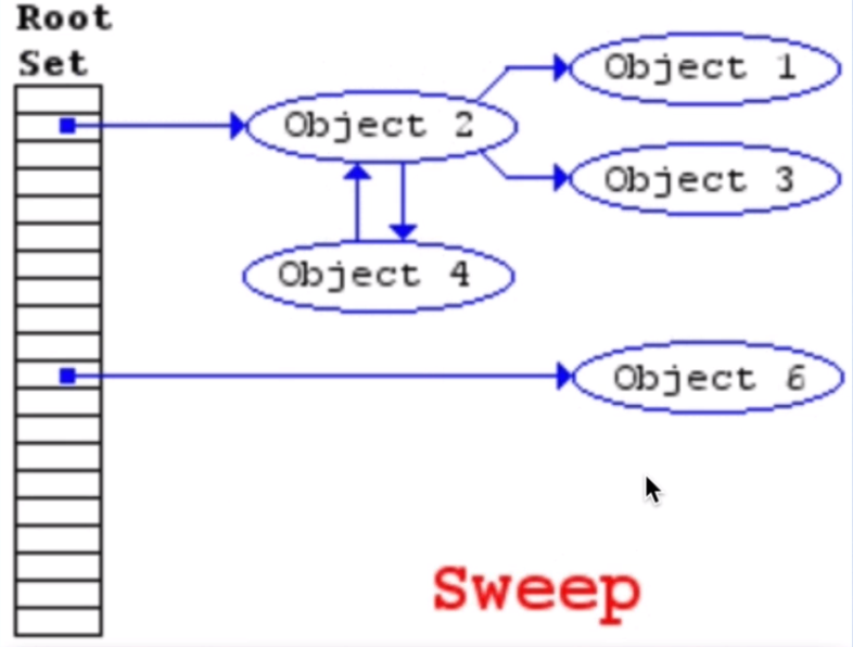 화살표가 닿지 않는, 참조되지 않는 데이터를 힙 공간에서 삭제하는 sweep과정을 거친다.