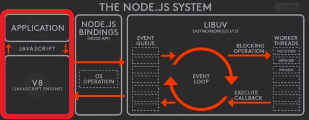 위 사진은 노드 js의 전체 시스템 아키텍처이다.