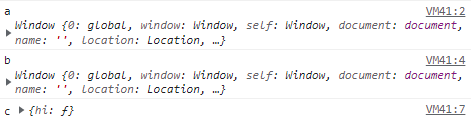 a함수의 this, b함수의 this, 그리고 c객체의 hi속성에 저장된 함수의 this는 어디를 가리킬까?