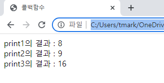 그리고 처음 생성했던 더하기 함수에 세번째 인자값으로 세개의 출력함수를 각각 넣었다.