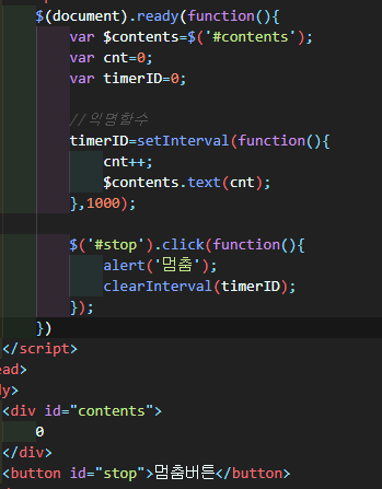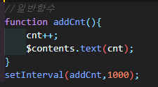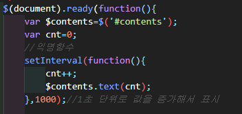 setInterval함수에 익명함수로 카운트를 증가시켜주며 div태그안에 증가된 값을 표시해준다.