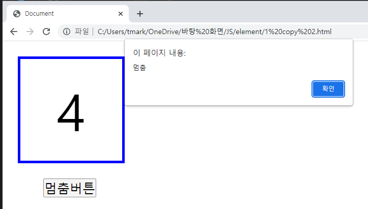 아까와 같이 숫자가 증가하다 버튼을 누르면 알림창과 함께 숫자가 멈추게 된다.