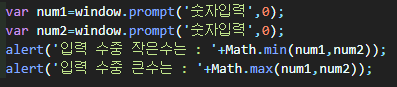 두 수를 입력하고 그 중 작은 수와 큰 수를 알림창에 나타낸다.