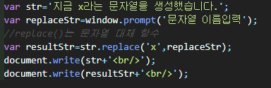 위 넷째줄 코드는 str변수에 저장된 문자열의 x문자를 replaceStr변수에 저장된 문자로 교체하여 resultStr에 저장한다.