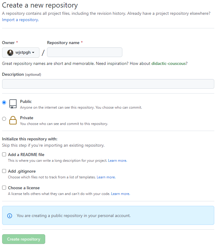 저장소 이름을 정해주고 바로 아래의 생성버튼을 눌러준다.