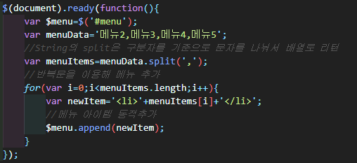 문자열을 배열로 변환해 html문서에 메뉴들을 추가해보도록 한다.