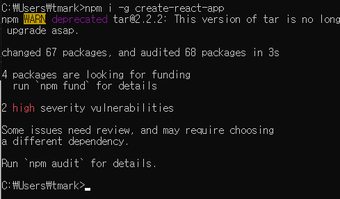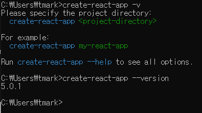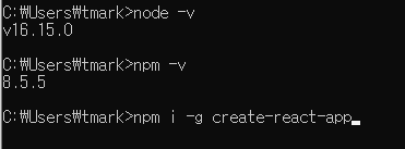 다운이 끝나면 cmd창에서 버전확인을 해주고 리액트앱을 설치해준다.