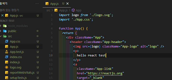 src에 App.js에 보면 p태그가 있는데 그 안의 내용을 원하는 내용으로 대체해주고 저장한다.