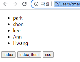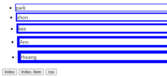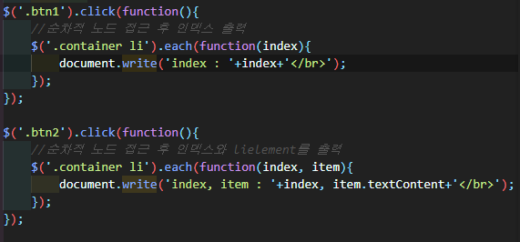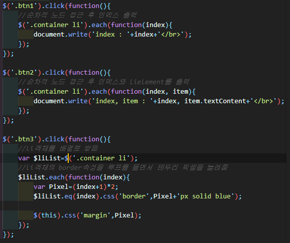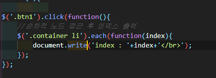 첫 번째 버튼을 누르면 each로 접근한 li태그들의 인덱스를 각각 구해준다.
