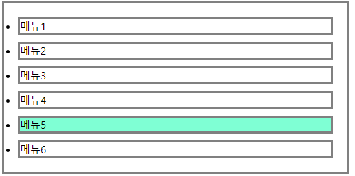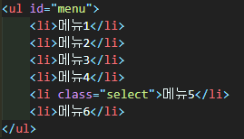 위와 같은 리스트형태에 버튼이나 li태그를 클릭하면 노드를 추가해본다. jQuery없이 JS로 노드 생성 메뉴가 6까지 생성되어 있으니 cnt변수의 초깃값을 6으로 지정하고 버튼이 클릭될 때마다 cnt값