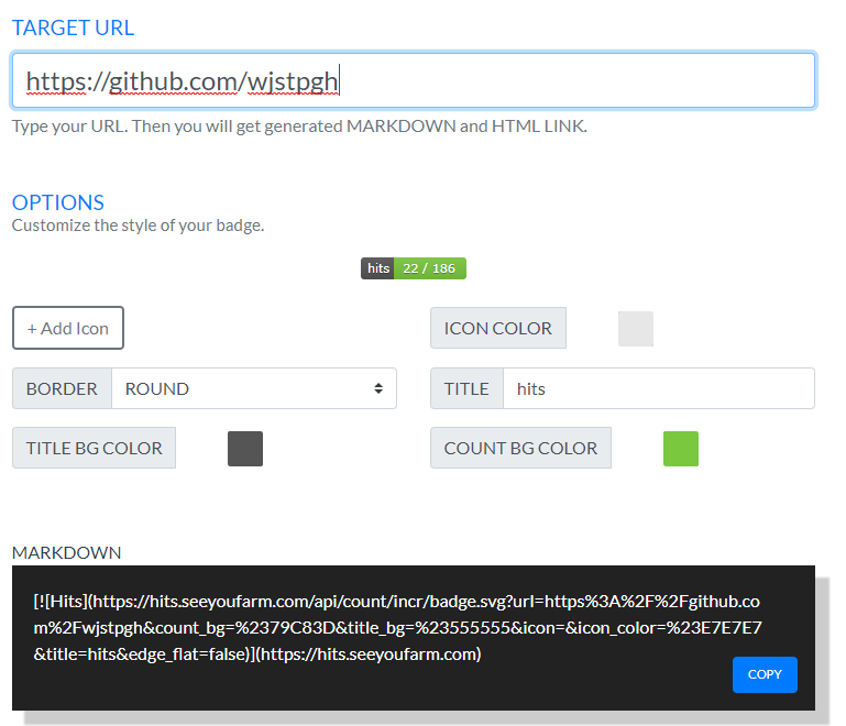 url에 본인 깃허브 주소를 작성해주고 아래 옵션을 만들면 아래 마크다운에 링크가 만들어지는데 그걸 복사해서