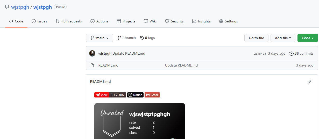 깃을 이력서로 사용하고, 1일1커밋을 하며 매일 개발자극을 받기 위해 프로필을 만들었다.