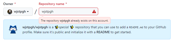 이미 만든 후라 경고문이 뜨지만 저렇게 본인 이름으로 저장소를 만들어주면
