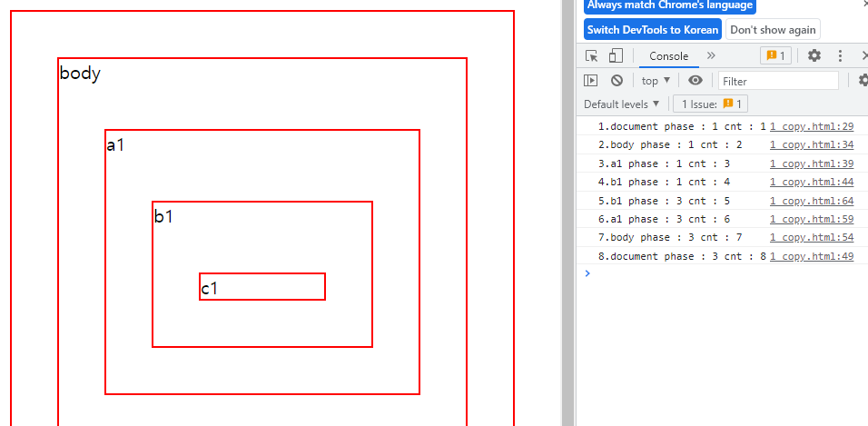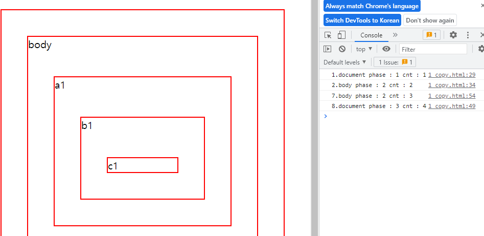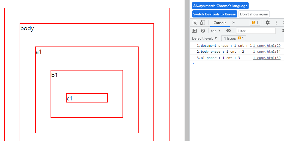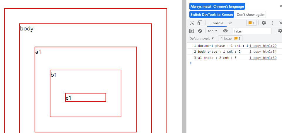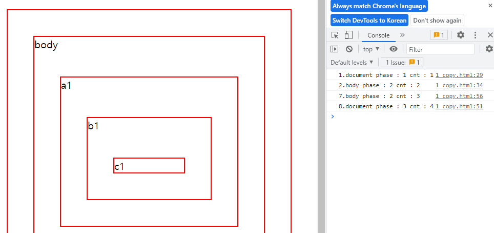 이번엔 a1안쪽의 b1을 클릭했는데 캡처단계인 1이 b1까지 찾아가다가
