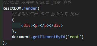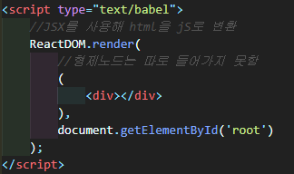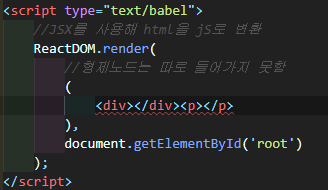 JSX가 html을 JS로 변환해주어 스크립트 태그안에서도 html태그문법을 사용할 수 있다.