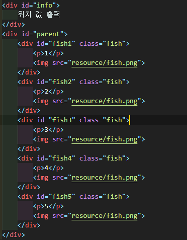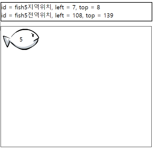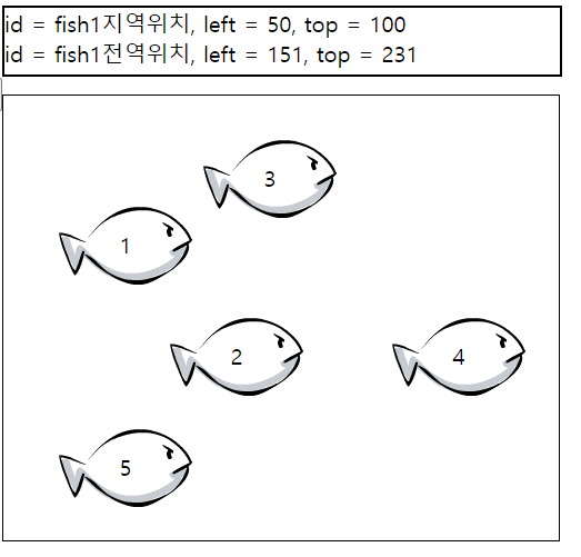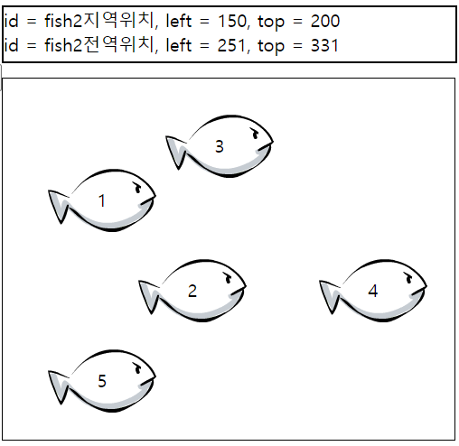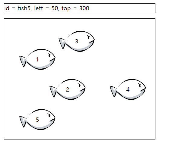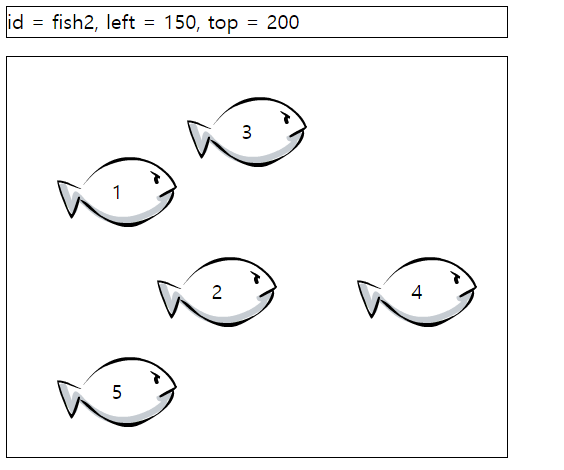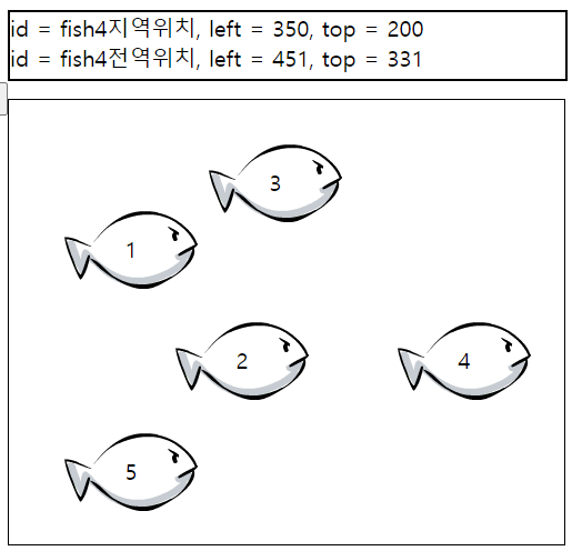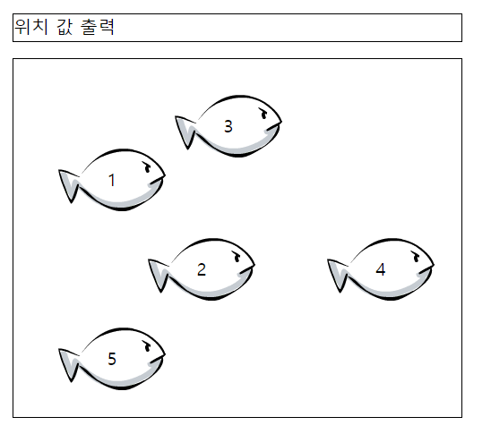 5개의 물고기 이미지를 두고 해당 사진을 클릭하면 위치를 위에 표시해본다.