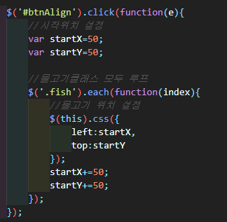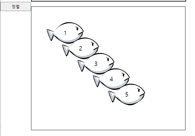 버튼을 클릭했을 때 (50,50)위치부터 50씩 더해서 물고기들을 정렬하도록 한다.