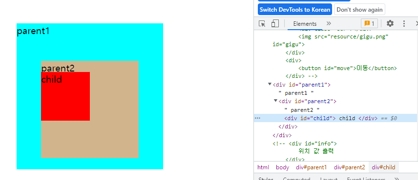 이유는 css의 position때문이다. 따로 position을 정해주지 않아서 parent2노드는 위치계층도에서 제외된다.