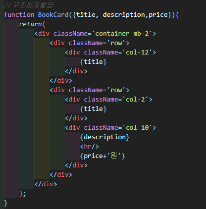 BookCard 컴포넌트에 속성으로 세가지가 전달된다면 그걸 그대로 인자에 써서 사용하는 방식이라고 보면 된다.