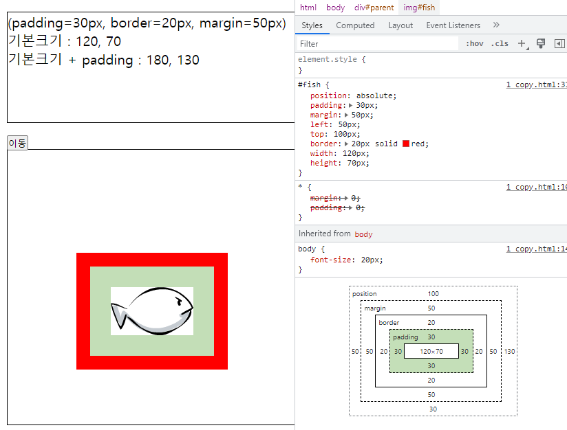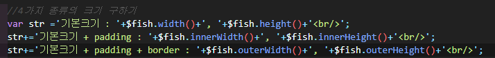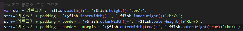 기본크기 + padding + border + margin - outerWidth(true), outerHeight(true)
