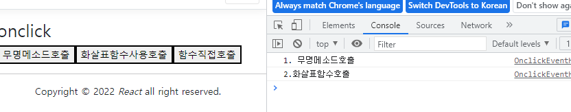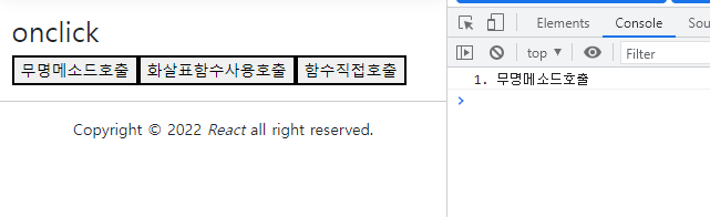 첫 번째 버튼 클릭 시 무명함수인 function()의 내용대로 콘솔에 내용이 찍힌다.