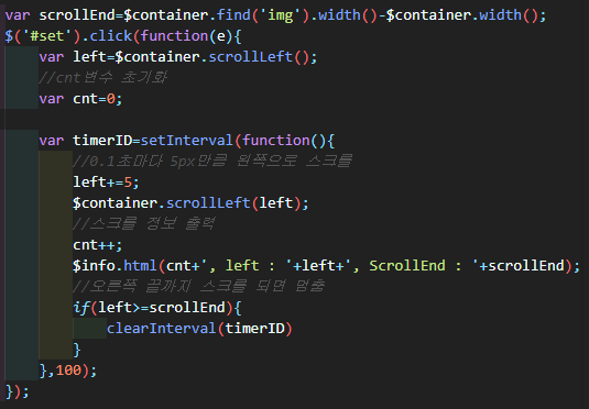 setInterval함수를 이용해 0.1초마다 오른쪽으로 5씩 이동시키며