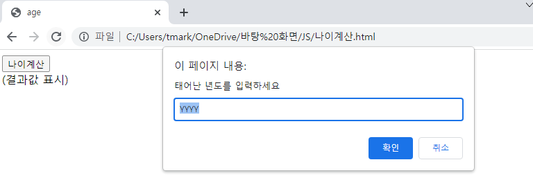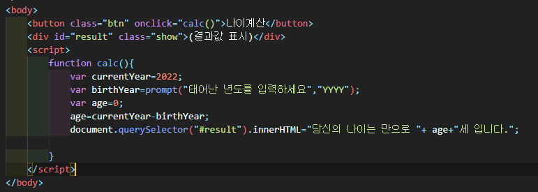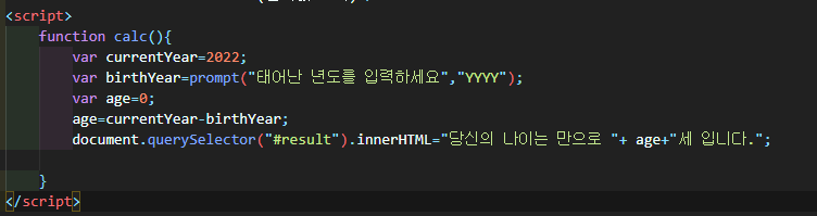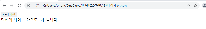 나이계산 함수를 button태그에 onclick이벤트 시에 호출되도록 했다.