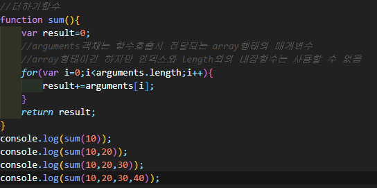 arguments는 함수 호출시 전달하는 매개변수를 array형태로 담고있다.