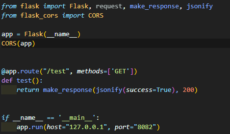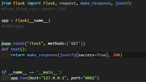 포트번호 8082에 라우팅 경로 test에서 데이터(success=True)를 response하도록 해뒀다.