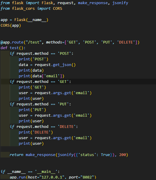 백엔드 서버 - 파이썬 Flask 포트번호 8082에 라우팅 경로 test에서 데이터(success=True)를 response하도록 해뒀다. 옆의 200은 Not Found:404처럼 서버 상태를 나타내는 번호이며 200은 정상연결을 의미한다...