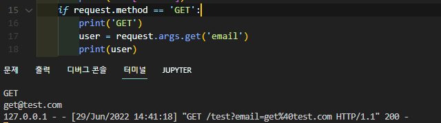 user값을 프린트 하여 get@test.com이 출력된다.