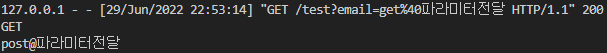 get방식으로 요청했을 시 마지막 줄과 같이 라우팅 경로에 파라미터 값이 적히는 것을 볼 수 있다.