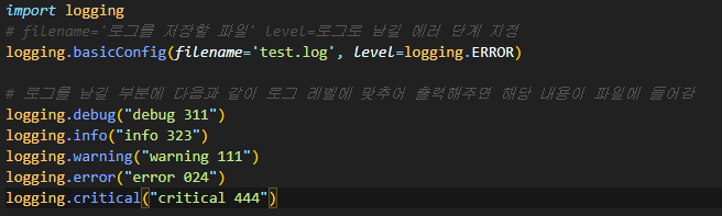 핸들러 설정을 해준 뒤 warning단계 이상의 로그를 저장하도록 설정한다.