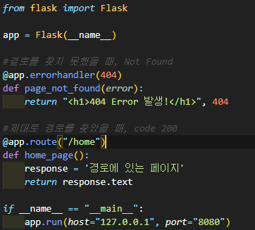 만약 경로에 없는 URL이 입력된다면 not found 코드인 404에 해당하는