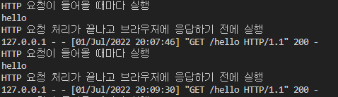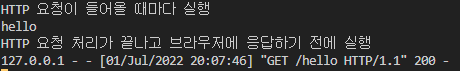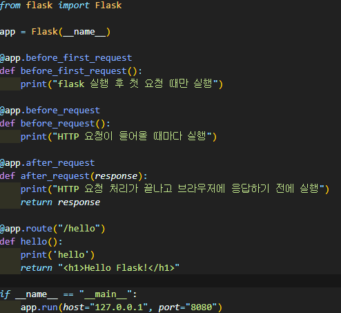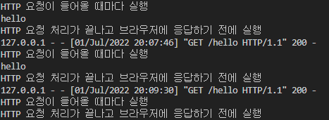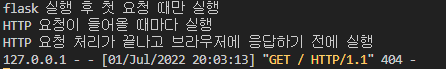 - after_request : HTTP 요청 처리가 끝나고 브라우저에 응답하기 전에 실행