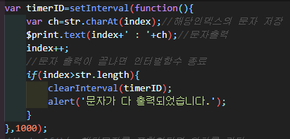 문자열의 길이를 넘어설 경우, 즉 모든 문자를 출력시 인터벌함수를 종료시켜준다.
